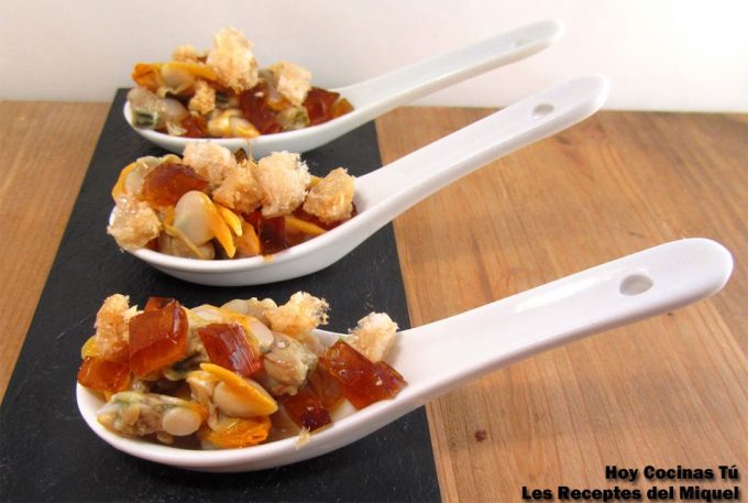 Bajo estas líneas tenéis la explicación paso a paso para hacer este aperitivo de berberechos y vermú del autor del blog Les Receptes del Miquel, veréis que es muy fácil de hacer, lo más laborioso es preparar una gelatina con el vermú que a cada uno le guste más, luego sólo hay que ensamblar elementos en las cucharillas. En cualquier caso, el bocado es ideal para un aperitivo de verano, así que tomad nota de la receta a continuación.