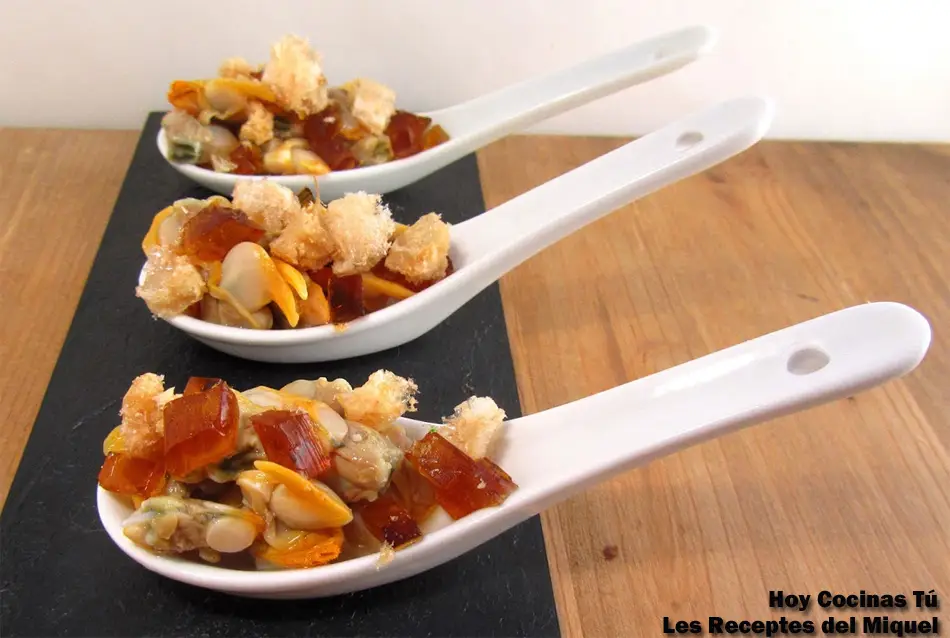 Los aperitivos servidos en cuchara son muy prácticos tanto para el cocinero como para el comensal, pues la presentación suele ser muy sencilla a la vez que mantiene una estética, y a la hora de comerlos es muy cómodo, pudiendo combinar sin problemas todos los sabores y texturas elegidos por el cocinero para este bocado. Si queréis probar alguna nueva receta de aperitivo en cuchara para sorprender y para disfrutar, tenéis que tomar nota de la propuesta que nos hace Miquel y que comparte en vuestra sección Hoy Cocinas Tú, es la receta de Berberechos al Martini con naranja y cortezas de cerdo.