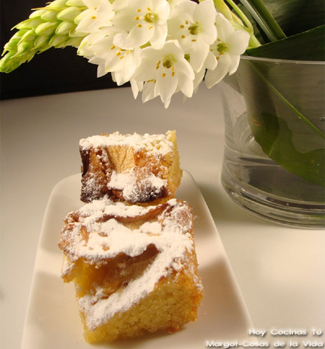 Una vez hecho el Bizcocho de manzana, dejamos enfriar sobre una rejilla y lo cortamos como queramos, yo lo hice a cuadraditos. Antes de servirlo, espolvoreamos el bizcocho con azúcar glas.