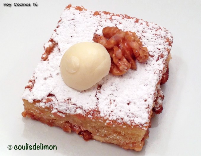 La mayoría de bizcochos de chocolate se hacen con chocolate negro o chocolate con leche, es el que más gusta y el auténtico chocolate. Pero también hay opciones para los que disfrutan más con el denominado chocolate blanco, poniendo como ejemplo uno de los dulces reposteros más admirados, el Brownie con nueces, se puede optar la versión con chocolate blanco, entonces se conoce como Blondie. Ya tenéis dos recetas de blondie en el blog, el Brownie de chocolate blanco con semillas de amapola y el Brownie de chocolate blanco y batata. Desde hoy podéis sumar otra receta para probar, es el Blondie con bombones y nueces caramelizadas que comparte en vuestra sección Hoy Cocinas Tú la autora del blog Coulis de limón, se llama Eli.
