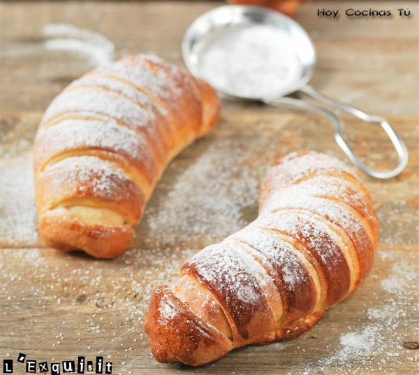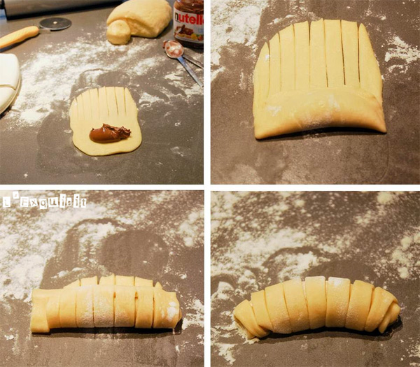En la otra mitad poner una cucharada de postre colmada de crema de chocolate (se puede rellenar también de mermelada en lugar de chocolate), doblar la masa encima, presionar los bordes y enrollar sobre las tiras de masa. Dar ligeramente una forma de media luna y disponer los bollitos sobre una bandeja forrada con silpat o papel sulfurizado. Tapar con un trapo y dejar reposar una hora a temperatura ambiente.