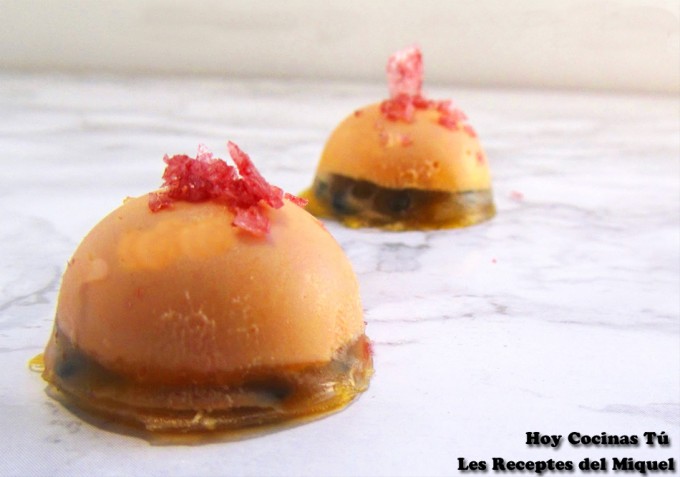 La combinación del foie micuit con una fruta ligeramente ácida y dulce como es la fruta de la pasión es estupenda, así que si os gustan este tipo de bocados, no dudéis en tomar nota de la receta de este Bombón de foie micuit que ha compartido con nosotros Miquel, autor del blog Les Receptes del Miquel. Si tenéis un molde de semiesferas quedarán como los veis, pero si les dais otra forma seguramente luzcan igual de bien.