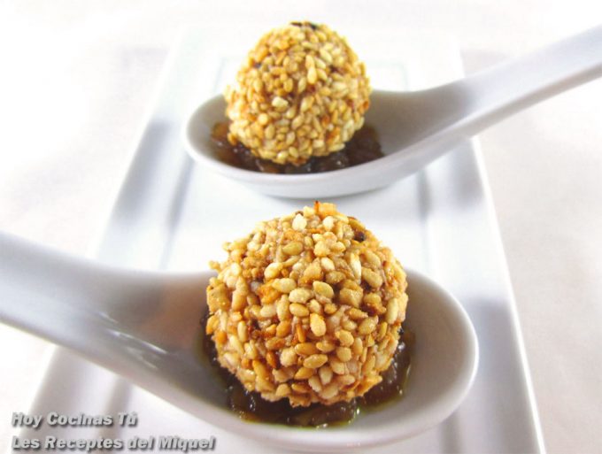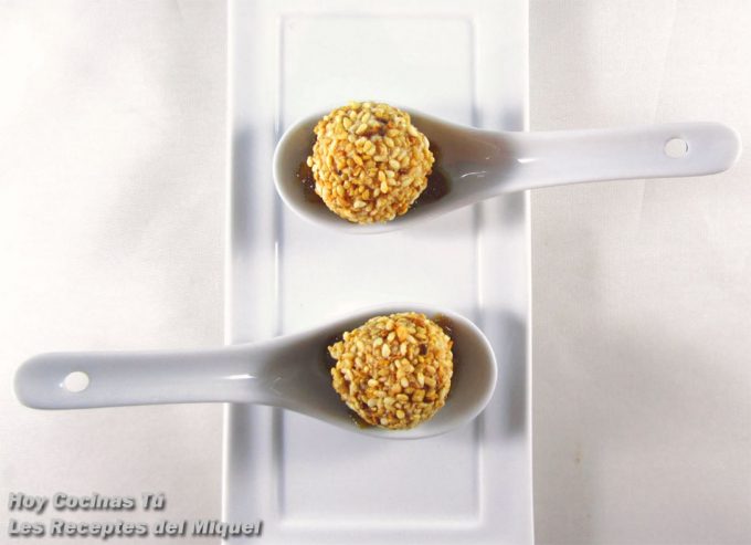 Pero si no conseguís ese producto, podéis hacer los bombones de foie con las semillas de sésamo tostadas, simplemente, o podéis caramelizarlas como se hace con otras semillas y frutos secos, aunque al ser tan pequeñas pueden quedar trozos más grandes. Pero, no pasa nada, pues se pican en el mortero, lo que piden estos bombones es un toque dulce de la caramelización, aunque también lo aporta la cebolla al Pedro Ximénez. Así que vosotros mismos decidís cómo adaptar esta receta de bombones de foie con sésamo, porque de cualquier forma va a ser un bocado exquisito e ideal para las fiestas navideñas.