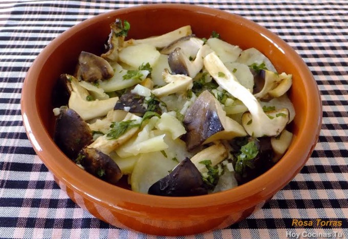 Servir las setas con patatas al horno en cazuelitas como entrante o como guarnición en un plato de carne o pescado.