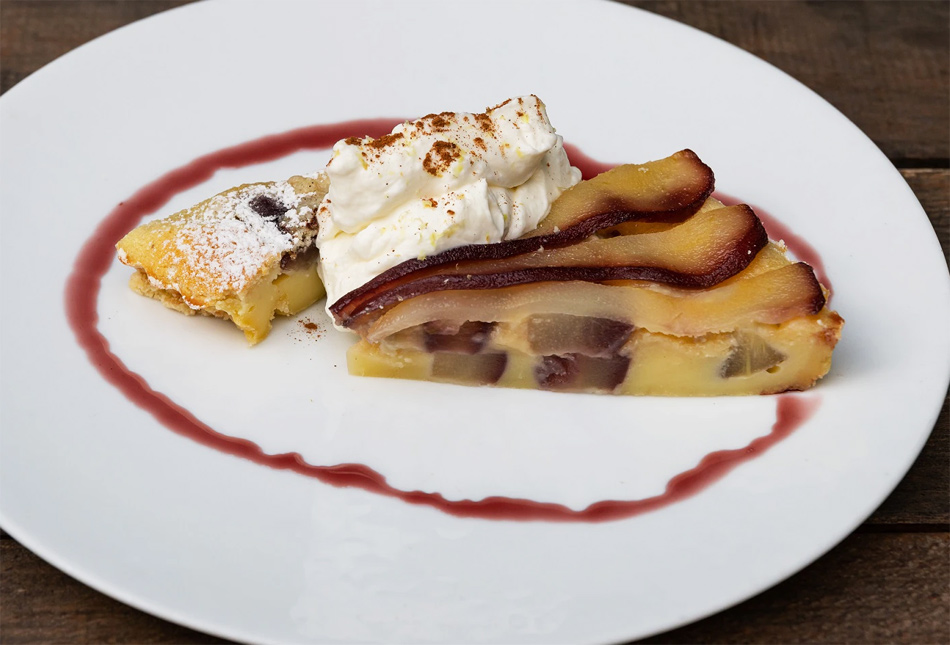 Servir la receta de Clafoutis de pera y pasas y cortarlo en porciones para cada comensal.