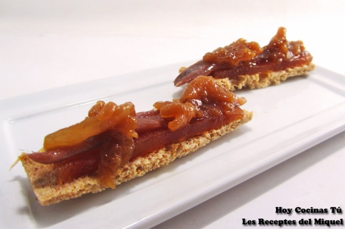 Es una tapa muy fácil de hacer, la coca en realidad no es una coca, se trata de pan de molde que se prensa con el rodillo y después se hornea para obtener una fina lámina de pan crujiente. Sobre él se sirve un poco de membrillo, una anchoa, cebolla caramelizada, cebollino y unas escamas de sal. En dos bocados el paladar se inunda de sabores, de textura, de mar, de tierra… A continuación Miquel os explica cómo hacer esta coca de membrillo y anchoa con cebolla caramelizada.