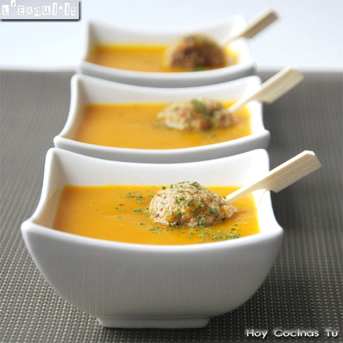 Servir la Crema de mango y calabaza templada acompañada de las albóndigas.