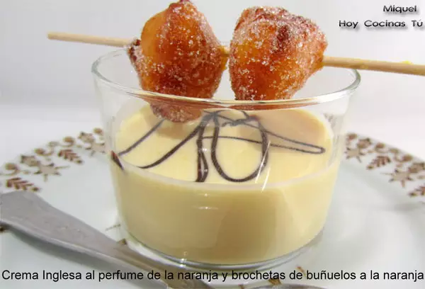 Teniendo naranjas durante una larga temporada, cualquier momento sería bueno para disfrutar de la Crema inglesa con buñuelos a la naranja que comparte en vuestra sección de recetas Hoy Cocinas Tú el autor del blog Les Receptes del Miquel, pero seguramente, dado que nos acercamos a fechas en las que por tradición, se consumen distintos tipos de buñuelos en todo el país, será una sorpresa para nuestros comensales presentárselos en un postre.