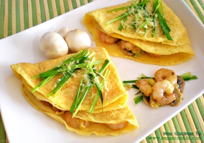 Receta de crêpes rellenos de champiñones, crema de puerro y gambas, una receta fácil de hacer, muy resultona y una buena propuesta para una cena informal, elaboración paso a paso.