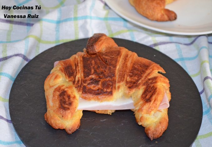 Recién sacados de la sartén, servimos los croissants a la plancha con jamón y queso, quedan crujientes y jugosos, muy ricos.