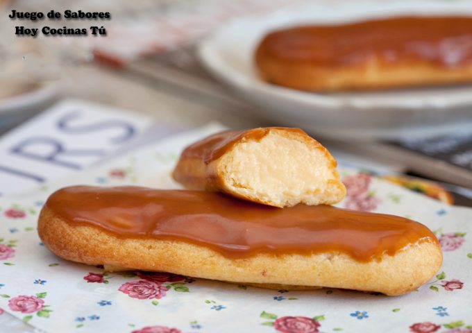 Pues dando forma alargada a esta masa se obtienen los èclairs, lo que se podría traducir como ‘relámpagos’, éstos se suelen rellenar de crema, frangipane, chocolate, confituras… Además se glasean con azúcares de colores, jarabes, caramelos, azúcar glas, etc. La propuesta de Ana y Blanca son unos Èclairs rellenos de crema pastelera y glaseados con caramelo de mantequilla salada, una verdadera delicia. Si os apetece probarlos, a continuación podéis tomar nota de la receta.