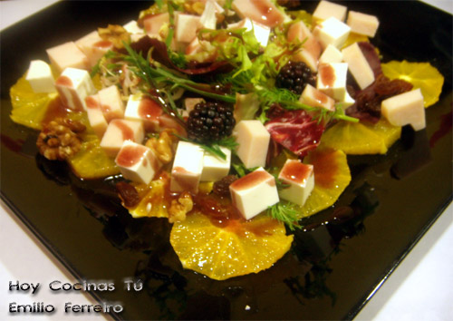 Antes de servir aderezar la Ensalada con carpaccio de naranja con la vinagreta de frambuesas bañando todos los ingredientes.