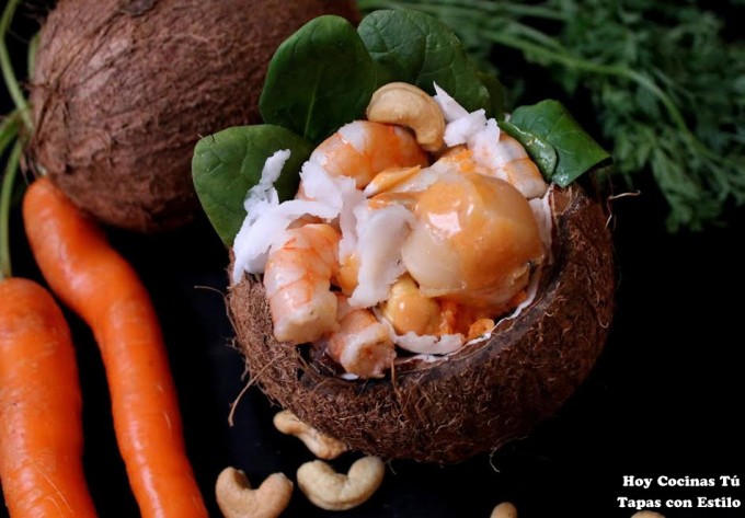 En la cascara de coco ponemos una base de hojas de lechuga, sobre ella vamos añadiendo la zanahoria, el coco, los anacardos, las vieiras y los langostinos. Regamos con la salsa de langostinos.