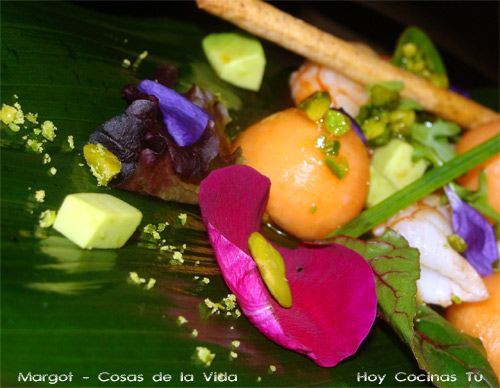 Colocamos las gambas sobre el plato o una hoja como en la foto, las acompañamos con las bolas de melón, el aguacate, un pétalo de rosa a cada lado, los brotes de ensalada y salpicamos con las violetas. Añadimos los pistachos picados a la vinagreta templada previamente y regamos la ensalada de flores, frutas y gambas. Añadimos un poco más de pistachos el cebollino y el bastoncillo de pan.