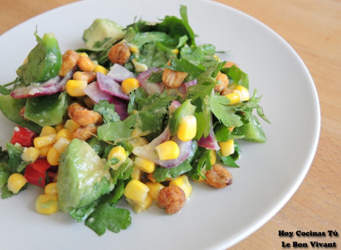 Pero es mucho más, es una ensalada con aguacate y pimiento verde, que combina con maíz dulce y maíz crujiente, los quicos. Adereza esta ensalada con una vinagreta de fruta de la pasión, mostaza, aove, naranja, lima… bueno, lo mejor es que veáis la receta de esta Ensalada con maíces a continuación, es muy fácil de hacer, podréis hacerla cualquier día de la semana puede servir el entrante.