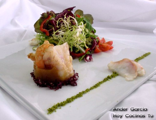 Además de un elegante plato, la Ensalada de rape en timbal de su jugo que comparte con nosotros Ander García, es un entrante sabroso y saludable. Hubiera sido un excelente plato para ofrecer a nuestros comensales en las fiestas navideñas (todavía queda el Día de Reyes con su suculento Roscón de Reyes), pero también es un primer plato ideal para estos días en los que después de los ‘banquetes’, necesitamos comidas más ligeras pero igualmente exquisitas.