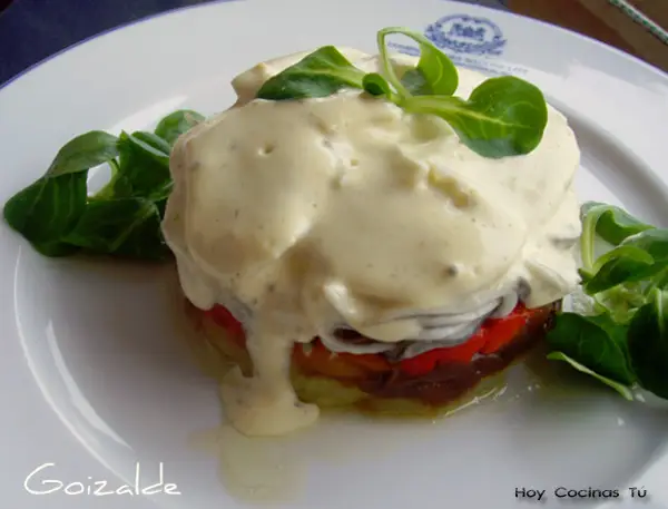 Colocar en la base la patata cocida, mojar con un poco del caldo de los pimientos para que las patatas tomen sabor. Sobre las patatas extender la cebolla caramelizada y sobre ésta, poner los pimientos. Es el turno ahora de las gulas y sobre éstas iremos colocando las láminas de bacalao, dejando las más grandes y bonitas para poner encima.