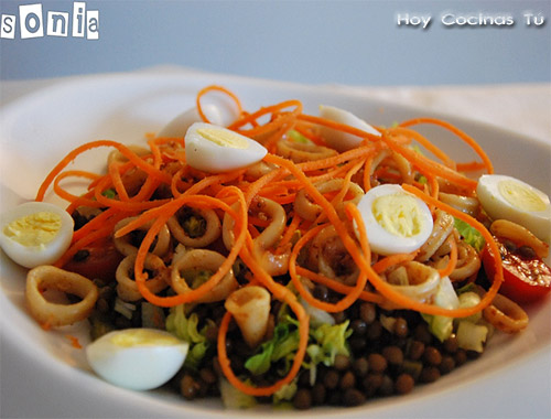 Estos días las legumbres están dando mucho de sí, mirad por ejemplo esta apetitosa receta de Ensalada templada de lentejas y calamares que la autora del blog L’Exquisit, Sonia, comparte con nosotros en vuestra sección de recetas Hoy Cocinas Tú.