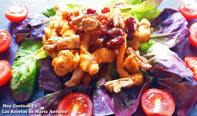 Las ensaladas de pollo son una de las que más gustan, todos tenemos más de una receta en la que el pollo forma parte de una ensalada, tanto fría como templada, y hoy tenemos una nueva propuesta para disfrutar de este entrante, la comparte en vuestra sección de recetas Hoy Cocinas Tú la autora del blog Las Recetas de María Antonia, es una Ensalada templada de pollo con vinagreta de caramelo.
