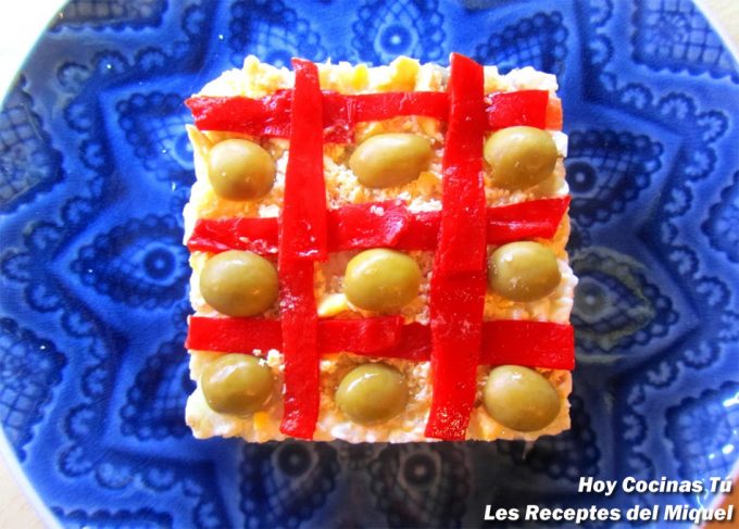 Servimos en los platos la ensaladilla con un aro de emplatar. Rallamos la yema de huevo por encima y ponemos unas tiras finas de pimiento haciendo como un enrejado y unas rodajas de aceitunas rellenas en cada cuadrado. Dejamos reposar en la nevera antes de servir.