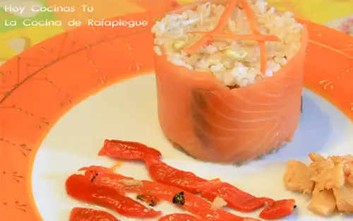 Un plato muy apetecible el que recibimos de La cocina de rafaplegue, Esgarraet con arroz y salmón ahumado. Personalmente nos encanta el esgarraet, es una receta de tradición valenciana que Rafael ha completado con un arroz integral y salmón.