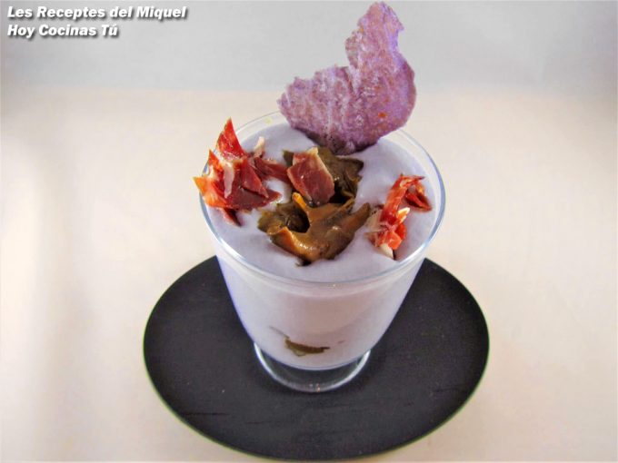 La combinación de patatas, setas y jamón es del gusto de todos, y si encima se combinan en una preparación culinaria como la que nos propone Miquel, autor del blog Les Receptes del Miquel, se convierte en un festín, porque además de disfrutar de un aperitivo delicioso, se puede apreciar el mimo con el que se ha elaborado y presentado, es ideal para iniciar el menú de un día especial. Ahora bien, nosotros posiblemente optaríamos por servir esta Espuma de patata con setas, jamón ibérico y papel de patata violeta en una copa más grande, que incluso podría convertirse en un entrante, ya nos contaréis qué pensáis vosotros.