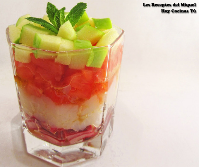 Poner en un vaso (o en el recipiente que se prefiera servir) la cebolla, luego el bacalao, el tomate y la manzana verde.