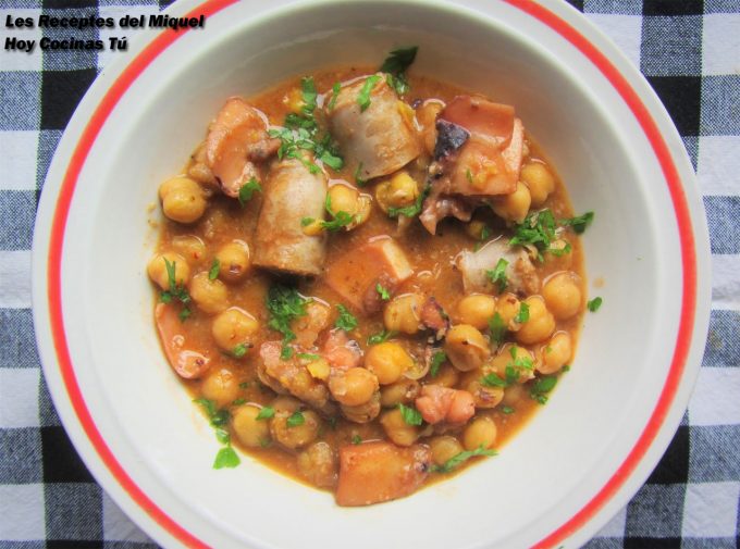 Seguro que ya lo sabéis, pero seguiremos insistiendo en que las legumbres en conserva son un gran aliado para las personas que no tienen mucho tiempo para cocinar y quieren disfrutar de una alimentación nutritiva y sana, en menos de media hora se puede preparar un plato de cuchara (o de tenedor, a nosotros nos encantan de las dos formas) como el que podéis ver ilustrando estas líneas, es el Estofado de garbanzos con sepia y salchichas cuya receta ha compartido con nosotros Miquel, autor del blog Les Receptes del Miquel.