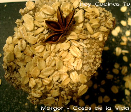 Lo dejamos enfriar y desmoldamos, entonces cortamos el bizcocho por la mitad, aclaramos la mermelada con un poco de agua, rellenamos con ella el bizcocho y volvemos a tapar. Untamos la superficie del bizcocho con otra capa de mermelada y espolvoreamos un poco de sésamo y la avena. Coronamos con un anís estrellado.