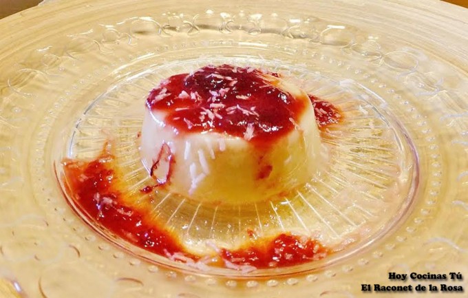 Buscando un postre fresco, saludable y fácil de hacer, aprovechando además una de las frutas de verano que más gustan a su autora, Rosa, nos presenta el Flan de coco y piña con caramelo de cerezas. En realidad no es un flan, se trata de una gelatina de una bebida preparada de arroz, coco y piña que se puede encontrar en tiendas de dietética y herboristerías.