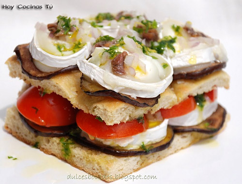 Aunque la focaccia generalmente la consumimos acompañando otras comidas o sola si está muy especiada, también podemos disfrutar de este pan italiano como nos propone Carmen del blog Dulces Bocados, relleno, y con muy buen gusto, es una Focaccia con berenjenas, anchoas y queso de cabra, ¿os apetece?