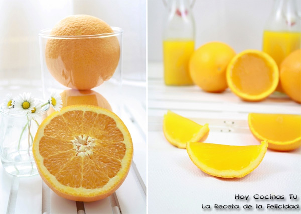 Para presentar la gelatina de naranja en las cáscaras de naranja, no hay más que lavar muy bien la piel antes de hacer el zumo, conservarla después de hacer el zumo, quitar bien los restos de naranja, y verter en ellas la mezcla, dejando enfriar después.