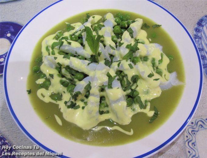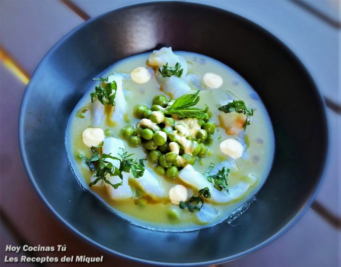 Servimos en un plato hondo un cucharón de la crema caliente, los guisantes, el bacalao desmigado y la mayonesa-vinagreta, unas cuántas hojas de menta un poco rota con los mismos dedos y un poco de pimienta. Y a disfrutarlo.