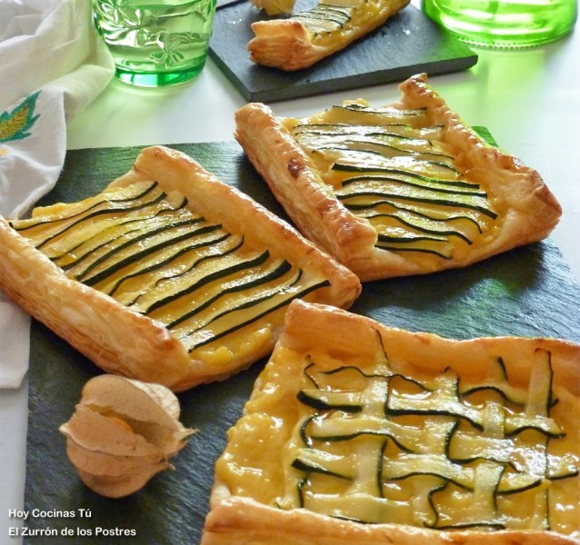 Las tartas de hojaldre con crema pastelera son una delicia para los golosos, se suelen cubrir con distintos tipos de fruta y así aprovechar las de temporada, manzana, fresas, melocotones, pera, moras… pero, ¿habéis probado con calabacín?, esta es la propuesta de la autora del blog El Zurrón de los Postres, el Hojaldre con calabacín y crema pastelera.