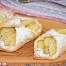 Colocamos la masa de hojaldre fresca sobre la tabla grande de cortar y hacemos cuadrados para hacer tartas de hojaldre individuales, y la pinchamos por el centro con un tenedor. Pintamos el borde con el huevo batido y horneamos a 200º C hasta que el hojaldre se haya dorado. Dejamos enfriar sobre una rejilla.