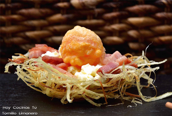 Es un huevo en nido con una presentación diferente. Los sabores primarios de unos huevos fritos con bacon y patatas ahí están, pero sin duda, es un plato con el que sorprender a los amigos o familiares. Alex nos anima a probarlo y además nos muestra la elaboración en un vídeo, podéis verlo en su blog, Tomillo limonero.