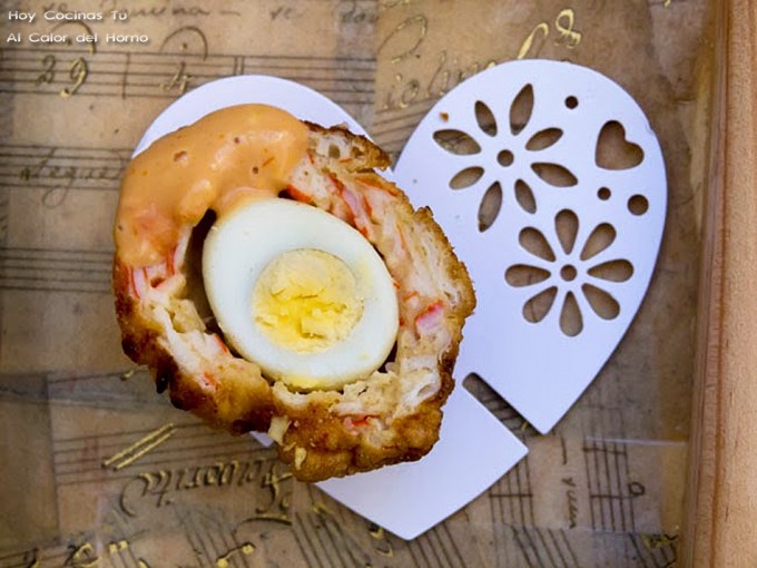 El huevo a la escocesa es una elaboración tradicional de Londres, no de Escocia como se podría pensar. Se trata de unos deliciosos huevos duros envueltos en carne y después rebozados, y normalmente se terminan en el horno. Pero los que veis en la foto son diferentes, es la versión que ha preparado Bego, autora del blog Al Calor del Horno, son los Huevos a la escocesa con cangrejo (surimi) que comparte en vuestra sección Hoy Cocinas Tú.
