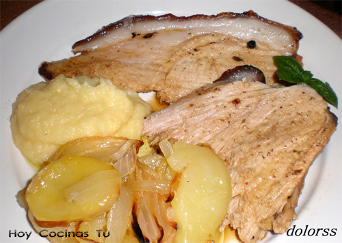 Cuando la carne esté cocida, ya podemos ir cortando las lonchas y acompañar con las patatas, la cebolla y el puré de manzana.