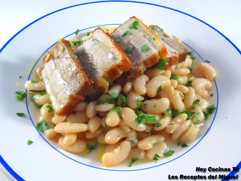 Cuenta que la receta en la que se inspiró estaba hecha con Fesols de Santa Pau, otra deliciosa legumbre con DOP, por lo que os recomendamos, si probáis esta receta del autor del blog Les Receptes del Miquel, es que la adaptéis con la alubia que sea de vuestra zona más próxima, en toda nuestra geografía hay magníficas legumbres y distintas variedades de alubias o judías que no tienen nada que envidiar a las otras, con vuestro producto podréis disfrutar de un reconfortante plato de alubias con papada de cerdo crujiente, veréis que la receta es muy fácil y resultona. Irresistible.