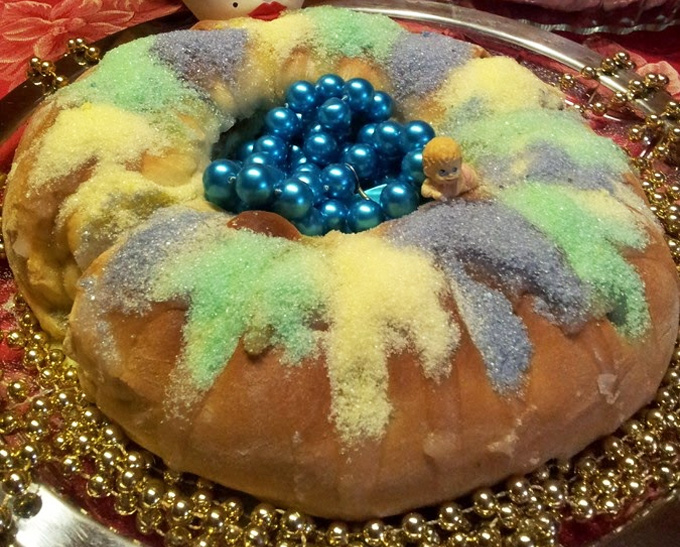 Una vez horneado el Roscón de Rey de Carnaval sacamos del horno y preparamos la escarcha con la taza de azúcar glas y una o dos cucharadas de agua, untando el bizcocho en caliente, dejando resbalar la mezcla por todo el roscón. Decoramos con los colores del Mardi Gras, las máscaras y los collares van a darle color a todo.