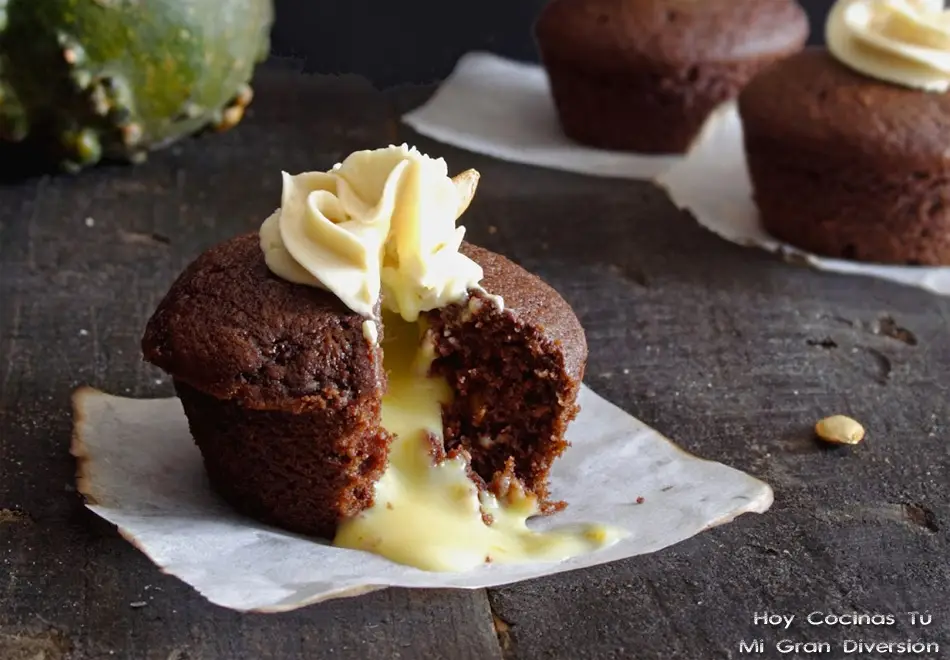 Las magdalenas de chocolate y calabaza rellenas de crema de naranja están listas para disfrutar, preséntalas en una bandeja o pie de tarta.