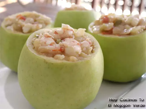 Hoy conocemos el blog El Mojojón Verde gracias a que su autor, Jon, comparte con nosotros una receta para vuestra sección Hoy Cocinas Tú, se trata de las Manzanas asadas rellenas de langostinos, sobre la que nos cuenta que es una elaboración rica y muy versátil, pudiendo utilizar otro tipo de ingredientes para la farsa, como merluza, rape o calamares frescos, también nos recomienda probar las manzanas asadas rellenas de carne, aunque en este caso, en lugar de la salsa que veréis en la explicación de la receta, sería ideal una salsa de cabrales o roquefort.