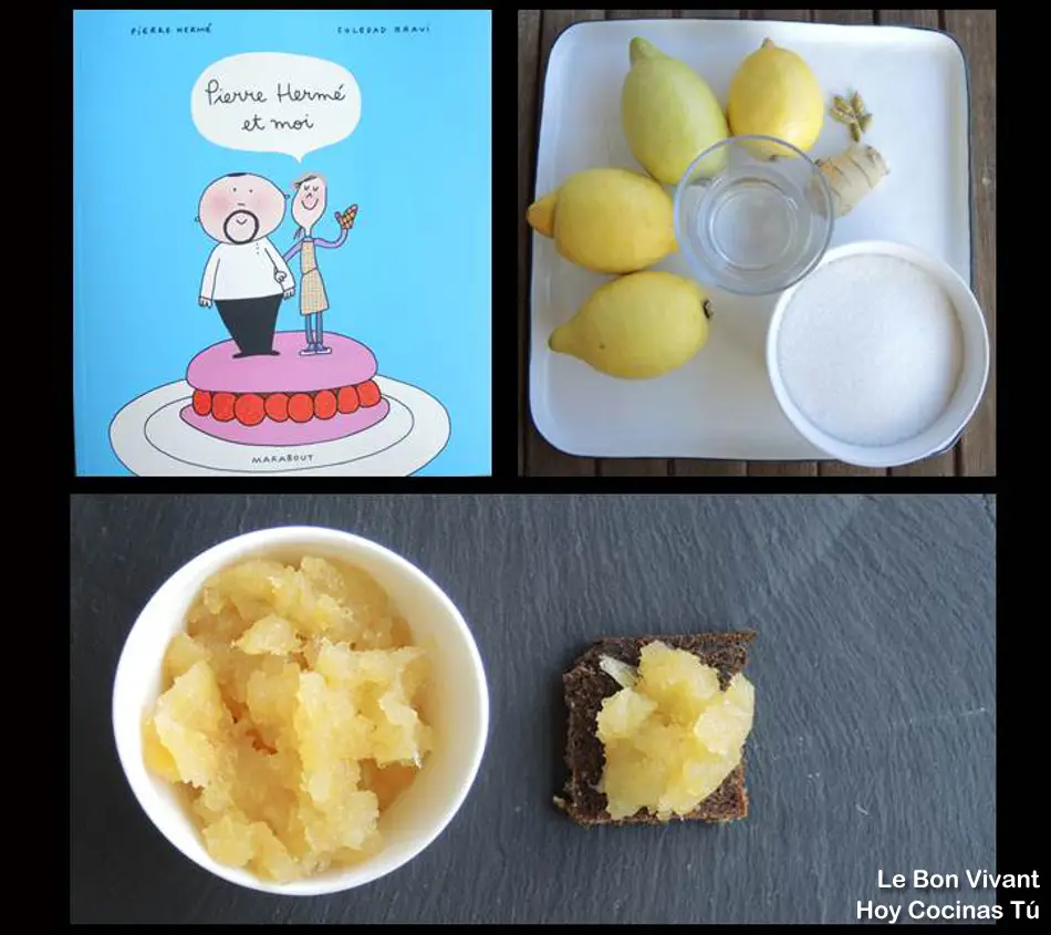 En la foto podéis ver la receta que comparte en vuestra sección Hoy Cocinas Tú la autora del blog Le Bon Vivant. Y también podéis ver la portada del libro del que ha extraído la Mermelada de limón, se titula Pierre Hermé et moi. Cristina nos cuenta que este nuevo libro es muy especial, es divertido, original, lleno de color y de humor, y de recetas del prestigioso pastelero. Si queréis conocer más detalles sobre esta publicación, que de momento sólo está en francés, podéis verlo en su blog.