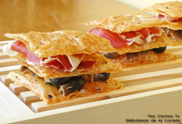 Entre otras particularidades, este milhojas está hecho con pasta filo o philo, ya sabéis que se trata de una pasta muy fina a la vez que versátil, y también delicada, no conviene que esté mucho al aire para que no se seque, y normalmente se pinta con mantequilla u otra materia grasa antes de hornearla. Pero seguro que ya lo sabéis, así que vamos con la receta del Milhojas de setas y jamón ibérico.