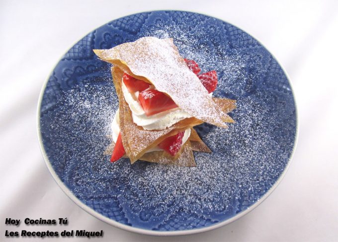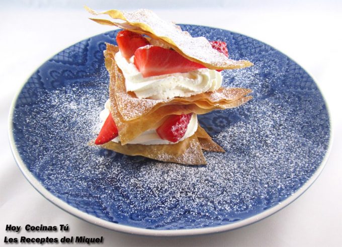 Empezamos la semana endulzando la cocina con un postre que gustará a todos, pues la combinación es magistral, fresas con nata, y para completar con un toque crujiente la degustación, se incorpora una masa fina y crujiente como es la pasta filo. Ilustrando estas líneas podéis ver el Milhojas de patas filo con nata y fresas que comparte en vuestra sección de recetas ‘Hoy Cocinas Tú‘ el autor del blog Les Receptes del Miquel, que nos cuenta que lo ha replicado en su cocina después de haberlo probado en el restaurante Àpat.