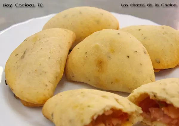 Cortamos la masa con un corta pastas en círculos de unos 9cm. de diámetro. Ponemos en cada uno una cucharada del relleno y cerramos la pizza depositando una mitad encima de la otra. Enrollamos los bordes asegurándonos que queden bien cerrados para evitar que se salga el relleno.