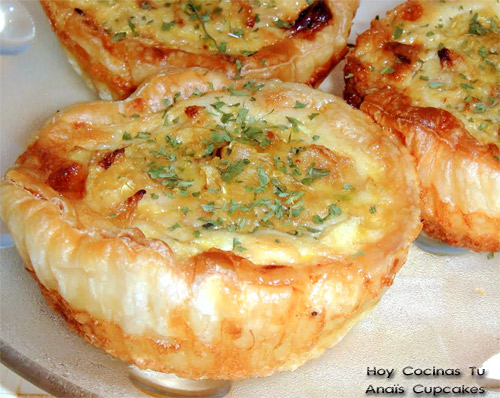 Precalentar el horno a 180º C. Cortar con la ayuda de un cortapastas unos círculos de hojaldres. Forrar los moldes individuales de tartaleta (previamente untados con mantequilla) con los discos de hojaldre, de forma que cubran bien toda la base y las paredes de los moldes.