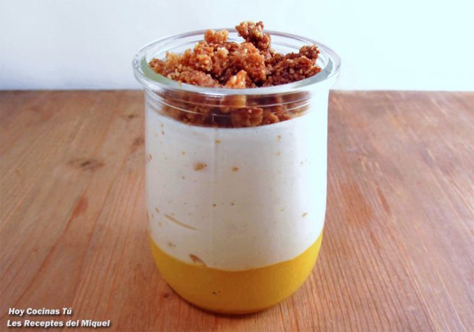 Si estáis pensando en el fin de semana (algo en lo que muchas personas piensan desde el lunes), haciendo planes para salir o para quedaros en el sofá viendo una película bajo la mantita… comer hay que comer, y el postre seguro que no lo perdonáis, así que id planeando también la posibilidad de hacer un postre especial como el que tenemos en vuestras sección de recetas Hoy Cocinas Tú y que comparte con nosotros Miquel, autor del blog Les Receptes del Miquel, se trata de unos vasitos de Mousse de turrón, mango y crumble de almendra que cunden mucho, así que también podréis invitar a vuestros amigos o a la familia para disfrutar de su compañía.