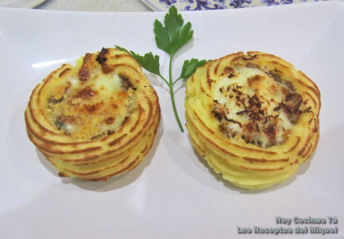 Con esta receta de Miquel, autor del blog Les Receptes del Miquel, podemos sorprender a nuestros comensales con unos nidos de patata diferentes, además de tener una presentación estupenda, imitando a las patatas duquesa, tienen un relleno que está para chuparse los dedos, sólo conociendo sus ingredientes, os lo podéis imaginar. Se trata de unos nidos de patata duquesa rellenos de cordero, tomate y mozzarella, y con un toque de parmesano para gratinar, una verdadera delicia ¿verdad?