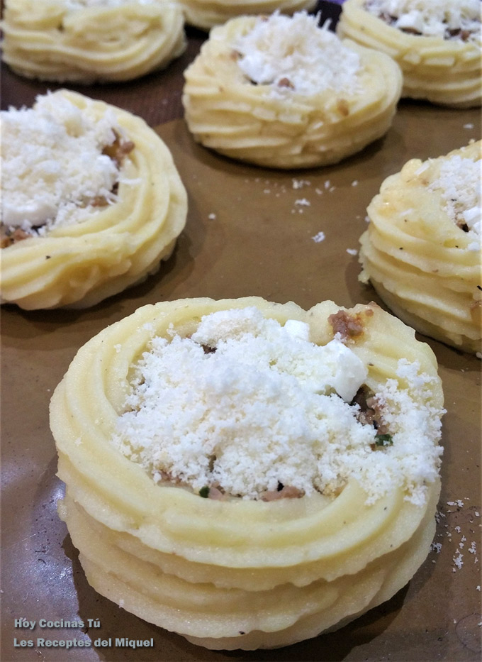 Marcar en una hoja de papel de cocina nueve discos de diámetro 60 mm y separados unos de otros, poner una cucharada sopera de patata encima de cada disco y aplanar dejando una base y la forma redonda. Poner el resto del puré dentro de una manga pastelera con boquilla rizada y hacer capas en el borde formando un nido (poner dos alturas de círculos en los bordes). Calentar el horno a 225º C.
